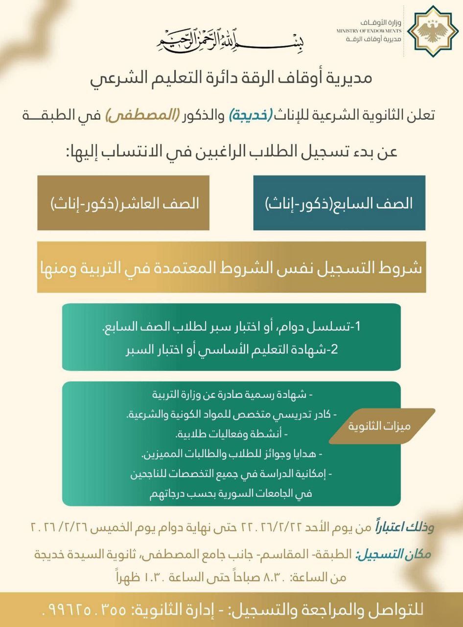 أعلنت مديرية أوقاف الرقة، عبر دائرة التعليم الشرعي، عن بدء التسجيل في الثانويات الشرعية بمدينة الطبقة للعام الدراسي الحالي، وذلك للطلاب والطالبات الراغبين بالانتساب إلى ثانوية الإناث (خديجة) وثانوية الذكور (المصطفى).