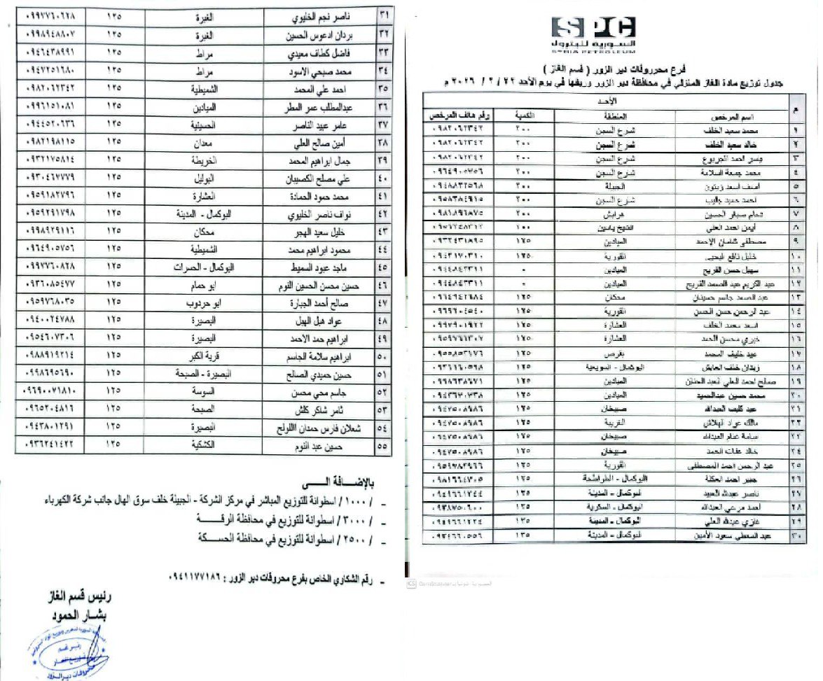 أصدرت الشركة السورية للبترول- فرع دير الزور قائمة بتوزيع أسطوانات الغاز المنزلي على المعتمدين في مدينة دير الزور وريفها لليوم الأحد 22 شباط 2026، بينت فيها اسم المعتمد ورقم هاتفه، ومكان المعتمد وعدد الأسطوانات لديه، وذلك حرصاً من الشركة، كما بينت على موقعها الرسمي، على وصول خدماتها لجميع المواطنين.