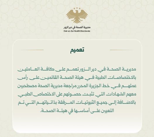 أصدرت مديرية الصحة في دير الزور تعميماً على كافة العاملين بالاختصاصات الطبية في هيئة الصحة، والقائمين على رأس عملهم في خط الجزيرة المحرر، لمراجعة مديرية الصحة مصطحبين معهم الشهادات التي تثبت حصولهم على الاختصاص الطبي، بالإضافة الى جميع الثبوتيات المرفقة بذاتياتهم التي تم التعيين على أساسها في هيئة الصحة.