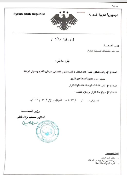 تكليف الدكتور نصر الخلف بتسيير شؤون صحة دير الزور عين الفرات في 24 شباط , 2026 شارك FacebookTwitterWhatsAppTelegramFacebook Messenger أصدر وزير الصحة الدكتور مصعب نزال العلي قراراً بتكليف الطبيب البشري وأخصائي أمراض الخدّج وحديثي الولادة الدكتور نصر عايد الخلف، بتسيير شؤون مديرية صحة دير الزور.