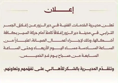 اغلاق الجسر الترابي في مدينة ديرالزور بسبب أعمال الصيانة عين الفرات في 25 شباط , 2026 شارك FacebookTwitterWhatsAppTelegramFacebook Messenger أعلنت مديرية الخدمات الفنية في ديرالزور عن إغلاق الجسر الترابي في المدينة إغلاقاً كاملاً أمام حركة السير بكافة أشكالها وذلك لإجراء أعمال الصيانة اعتباراً من الساعة السادسة مساء اليوم وحتى الساعة السابعة من صباح يوم غدٍ الخميس