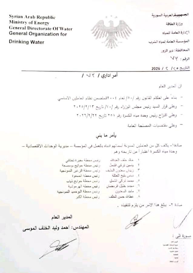 وتأتي هذه التعيينات في إطار تحسين إدارة خدمات المياه وتطوير العمل في محطات المياه المنتشرة في مناطق ريف دير الزور.