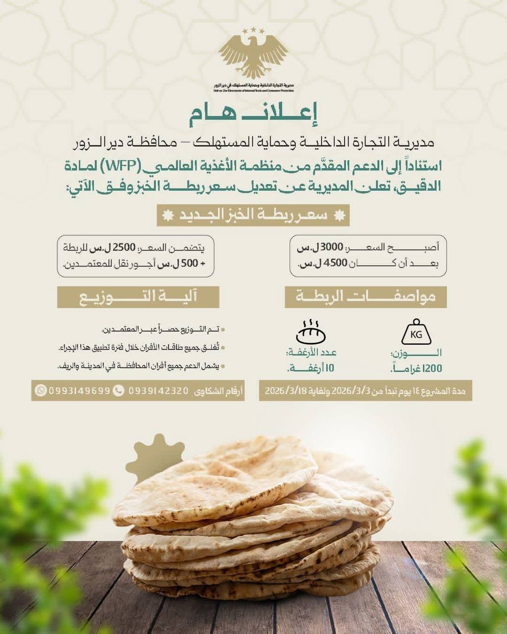 أعلنت الجهات المعنية في مدينة الميادين عن بيع ربطة الخبز المدعوم بسعر 3000 ليرة سورية، اعتباراً من يوم أمس الاثنين، عبر المناديب ومن خلال الأكشاك المخصصة لتوزيع الخبز في المدينة.