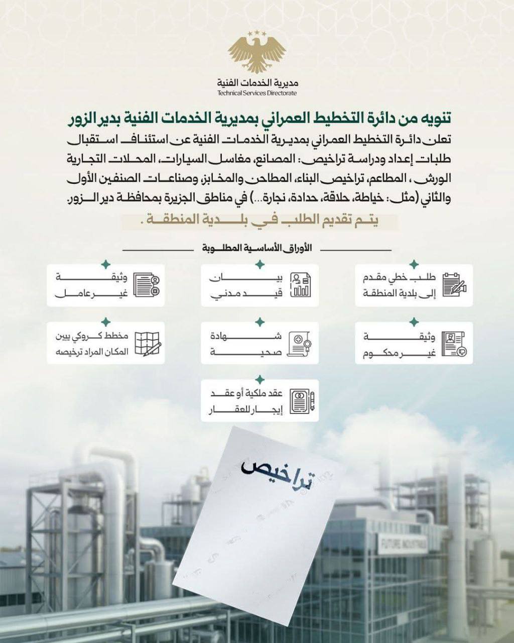 أعلنت دائرة التخطيط العمراني التابعة لمديرية الخدمات الفنية في محافظة دير الزور استئناف استقبال ودراسة طلبات التراخيص للمنشآت الاقتصادية والخدمية في مناطق “الجزيرة” بالمحافظة، في خطوة تهدف إلى تنظيم المهن وتنشيط الحركة الاقتصادية في المنطقة.