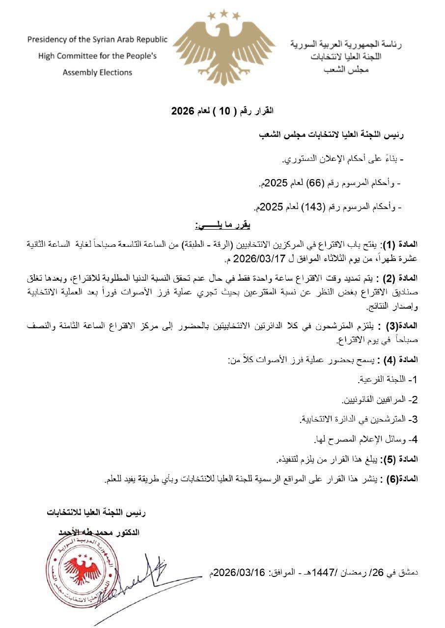 أصدر رئيس اللجنة العليا لانتخابات مجلس الشعب، الدكتور محمد طه الأحمد، القرار رقم (10) لعام 2026، والذي يتضمن التعليمات التنفيذية والجدول الزمني لعملية الاقتراع في مركزي الرقة والطبقة.