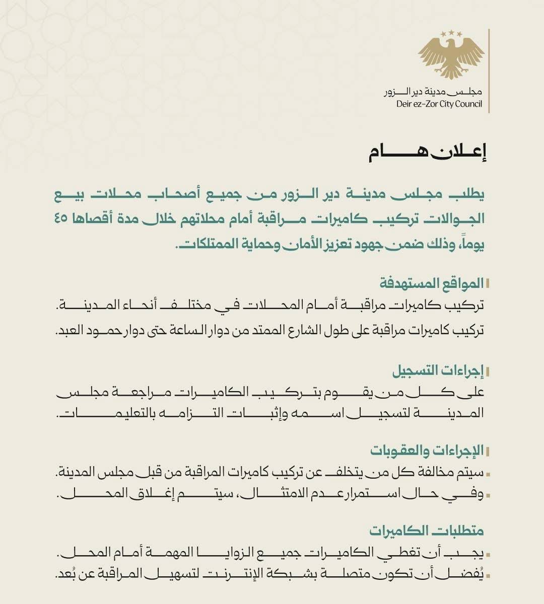 أصدر مجلس مدينة دير الزور قراراً يلزم جميع أصحاب محلات بيع الهواتف المحمولة بتركيب كاميرات مراقبة أمام محلاتهم، في خطوة تهدف إلى تعزيز الأمن وحماية الممتلكات