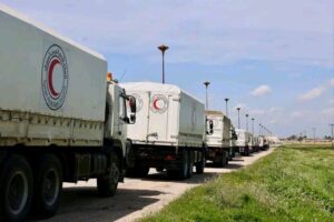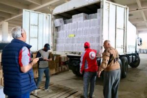 وتحمل القافلة 1004 سلة غذائية و4200 سلة صحية و4000 بطانية و2378 فرشة، مقدّمة بدعم من الاتحاد الدولي لجمعيات الصليب الأحمر والهلال الأحمر، والصليب الأحمر النرويجي، والصليب الأحمر الألماني.
