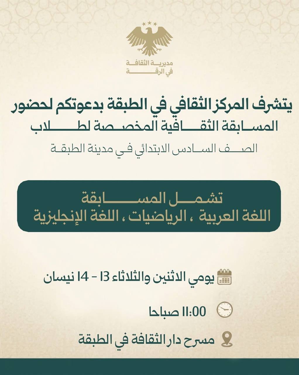 تدعو مديرية الثقافة في محافظة الرقة جميع المهتمين لحضور المسابقة الثقافية المقررة لطلاب الصف السادس الابتدائي في مدينة الطبقة، والتي تشمل مجالات اللغة العربية، الرياضيات، واللغة الإنجليزية.