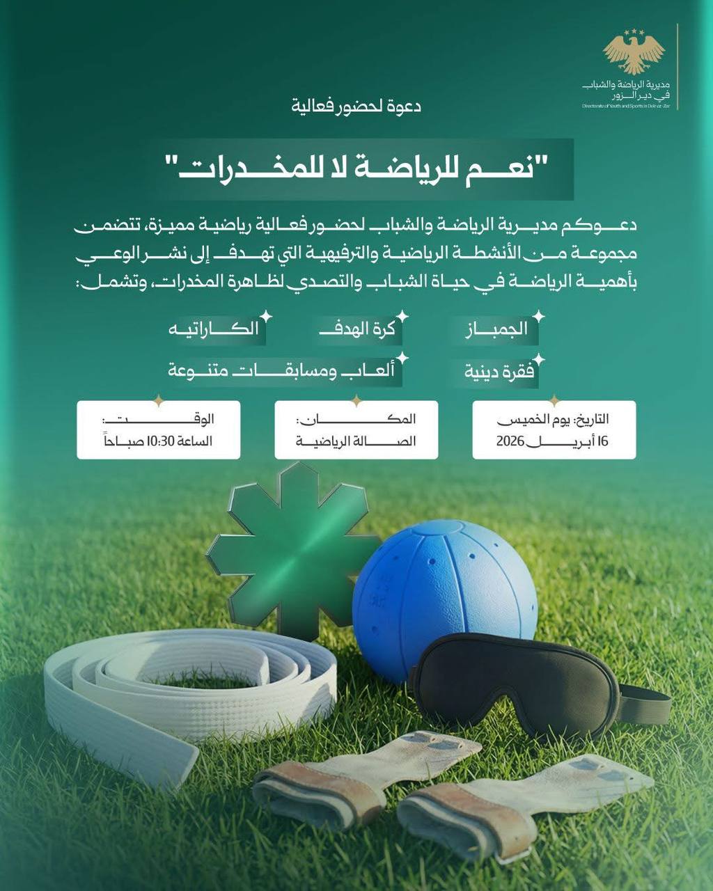 أعلنت مديرية الرياضة والشباب في دير الزور عن تنظيم فعالية رياضية مميزة تحت شعار “نعم للرياضة لا للمخدرات”، وذلك يوم غداً الخميس، ابتداءً من الساعة 10:30 صباحًا في الصالة الرياضية.
