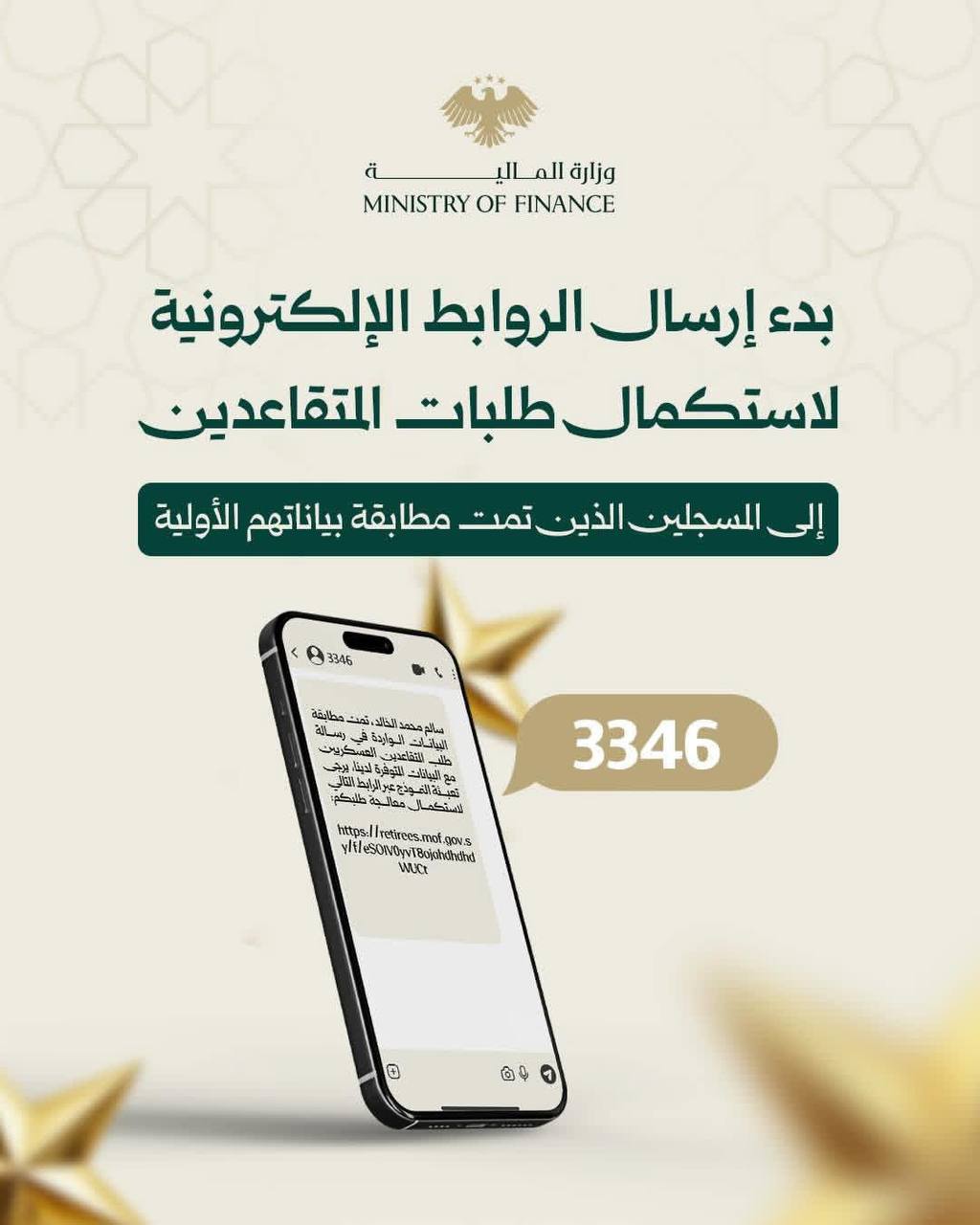 تعلن وزارة المالية بدء إرسال الرسائل النصية المتضمنة روابط استكمال طلبات المتقاعدين والمستحقين، وذلك بعد مطابقة البيانات الواردة في رسائل التسجيل مع البيانات المتوفرة لدى الجهات المعنية.