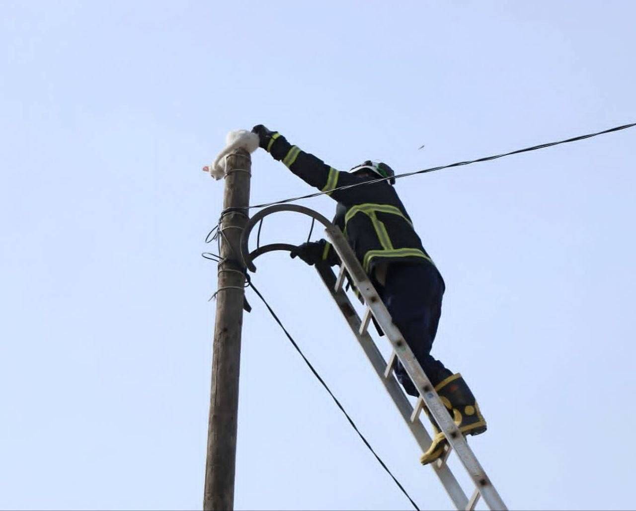 استجابت فرق الدفاع المدني السوري في محافظة الرقة لنداء استغاثة أطلقه الأهالي، بعد تعلق قطة على عمود كهرباء في شارع القطار وسط المدينة.