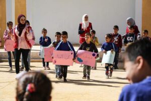 نفذ متطوعو الهلال الأحمر العربي السوري عدة أنشطة توعوية حول مخاطر الألغام ومخلفات الحرب في مدرسة محمد البطمان في حي الرصافة بدير الزور.