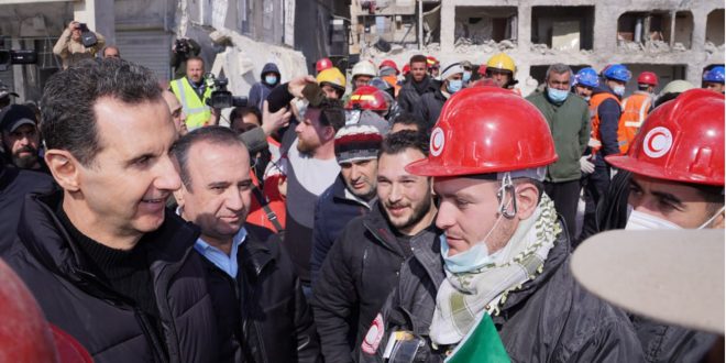 زار السيد الرئيس بشار الأسد اليوم موقعاً تعمل فيه فرق الإنقاذ على رفع الأنقاض والدمار لانتشال المصابين وضحايا الزلزال بحي المشارقة بمدينة حلب.