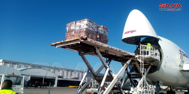 وذكرت مراسلة سانا إن الطائرة تحمل 87 طناً من المواد الغذائية والألبسة.
