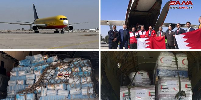 ومن مطار دمشق الدولي أوضحت مراسلة سانا أنه وصلت صباح اليوم طائرة مساعدات إماراتية تحمل 105 أطنان و700 كيلوغرام من المواد الغذائية، كما وصلت طائرة مساعدات أرمينية يرافقها وفد رسمي برئاسة وزير الخارجية الأرميني ارارات ميرزويان، وتحمل على متنها 36 طنا و600 كيلوغرام من المواد الإغاثية سيتم تفريغها في مطار حلب الدولي.