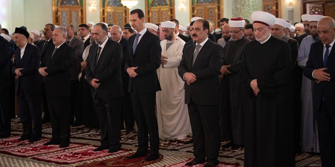 أدى السيد الرئيس بشار الأسد صباح اليوم صلاة عيد الفطر السعيد في رحاب جامع القائد الخالد حافظ الأسد في حي المزة بدمشق.