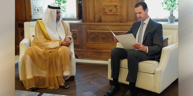 استقبل السيد الرئيس بشار الأسد يوم أمس عبد الحكيم النعيمي القائم بأعمال سفارة دولة الإمارات العربية المتحدة في دمشق والذي سلّم سيادته دعوة رسمية موجهة من صاحب السمو الشيخ محمد بن زايد آل نهيان رئيس دولة الامارات العربية المتحدة لحضور مؤتمر الأطراف للمناخ (COP28) الذي سيقام في دبي ما بين 30 تشرين الثاني لغاية 12 كانون الأول.