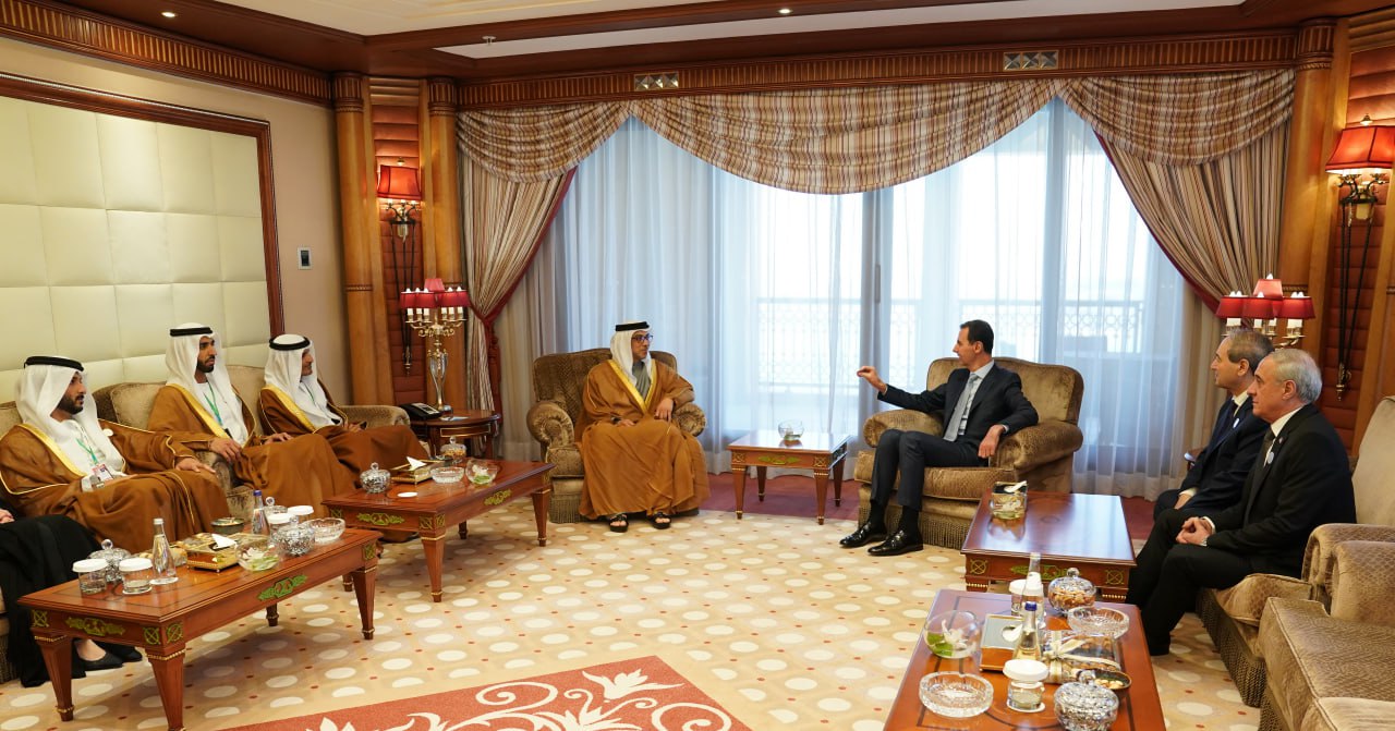 ونقل الشيخ منصور للرئيس الأسد تحيات صاحب السمو محمد بن زايد آل نهيان رئيس دولة الإمارات.