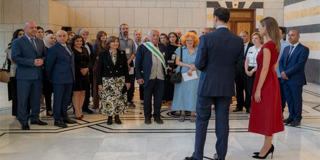 الرئيس بشار الأسد والسيدة الأولى أسماء الأسد يستقبلان أعضاء البعثات الأجنبية والخبراء السوريين المشاركين في المؤتمر.