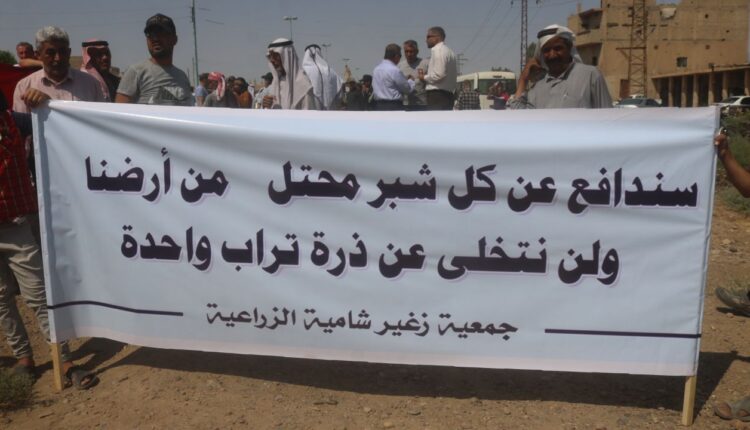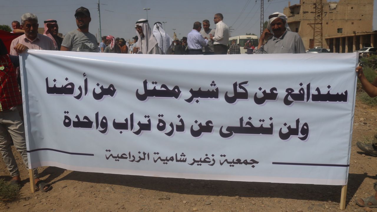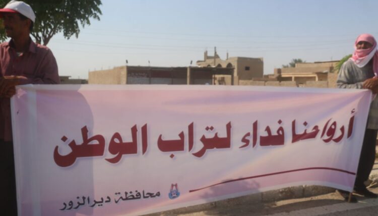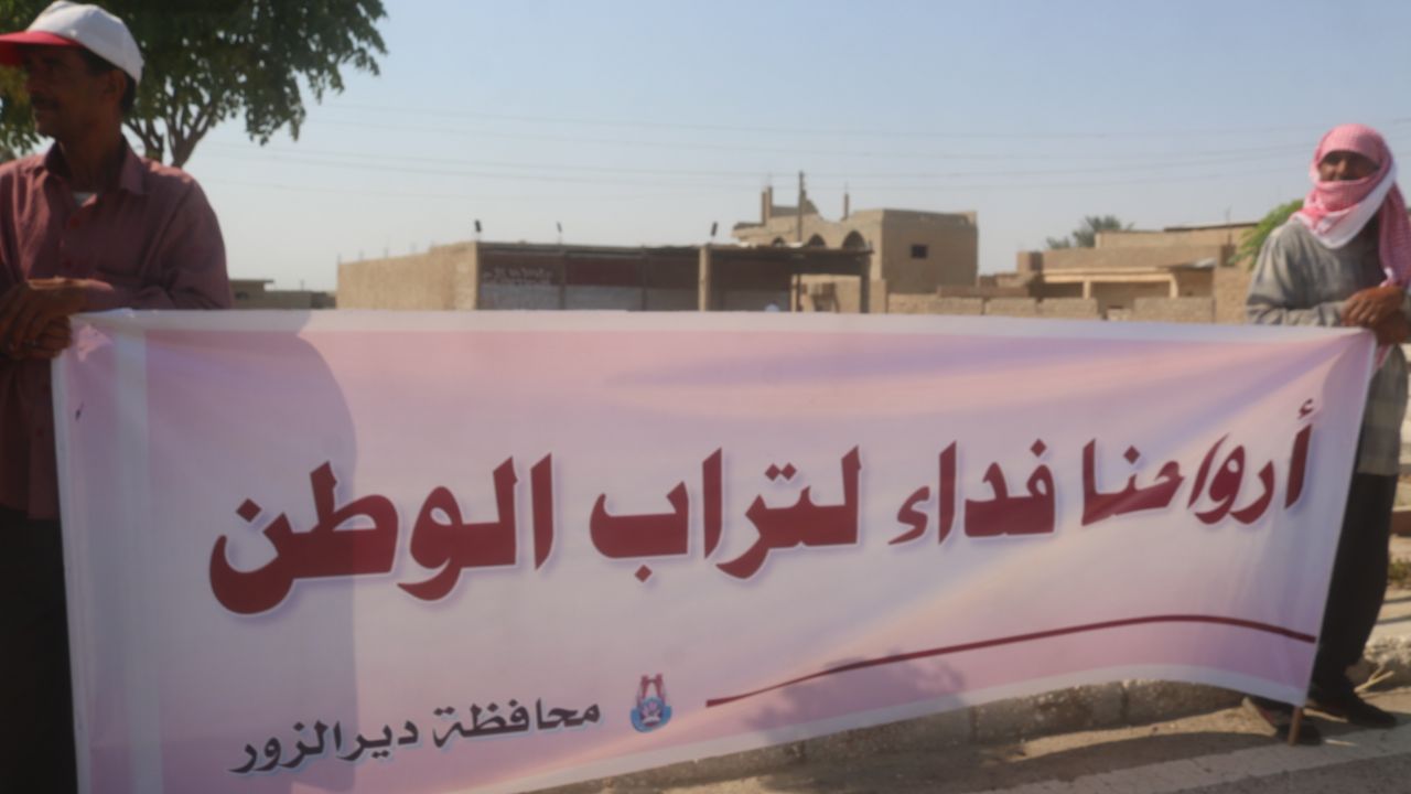 نفذ أهالي البلدات السبع المحررة بريف دير الزور الشمالي اليوم وقفة احتجاجية عند جسر الصالحية الذي يبعد امتارا عن مناطق تواجد قوات الاحتلال الأمريكي شارك بها محافظ دير الزور فاضل نجار وامين فرع حزب البعث العربي الاشتراكي رائد الغضبان وعدد من الشيوخ والوجهاء والأهالي .