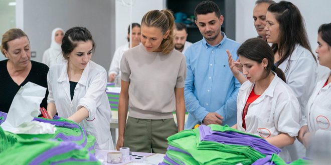 زارت السيدة الأولى أسماء الأسد معمل الألبسة ضمن مجمع المثنى الإنتاجي بريف طرطوس، والذي انطلق من مشغل صغير بمجموعة قليلة من العاملين والعاملات، ليصبح اليوم مجمَّعاً إنتاجياً كبيراً يضم المئات ممن امتلكوا المهنة والمهارة، ممزوجة بشغف العمل والإنتاج، فأصبحوا منتجين بحقّ، وأصبح هذا المجمَّع مثالاً عن أن الرؤية والإرادة هي التي تصنع الإمكانيات وليس العكس.