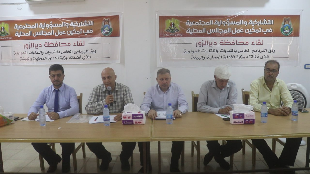 محافظ دير الزور فاضل نجار أكد أن هذا اللقاء يأتي استكمالا للبرنامج الحواري الذي أطلقته وزارة الإدارة المحلية والبيئة في مجال تمكين عمل المجالس المحلية بالتشاركية مع المجتمع المحلي، بهدف مساعدتها على ممارسة دورها التنموي والخدمي وتحسين الوضع المعيشي لمواطنيها وإعطائها المزيد من الاستقلالية، من خلال طرح رؤى وأفكار ومقترحات تشمل مختلف الجوانب بما فيها إدخال تعديلات على التشريعات وجعل المجتمع المحلي مسؤولاً عن الحفاظ على موارده المالية وتنميتها.