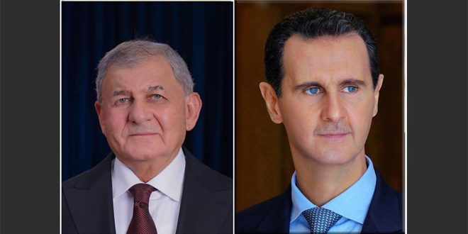 تلقى السيد الرئيس بشار الأسد برقية تعزية من الرئيس العراقي عبد اللطيف جمال رشيد بشهداء الاعتداء الإرهابي الذي استهدف حفل تخريج طلاب ضباط الكلية الحربية في حمص.