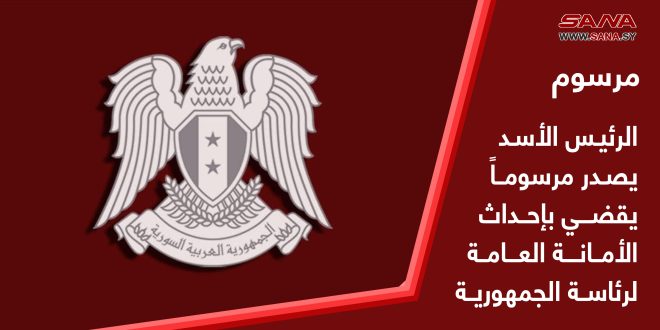 أصدر السيد الرئيس بشار الأسد المرسوم التشريعي رقم (38) الذي يقضي بإحداث “الأمانة العامة لرئاسة الجمهورية” وتتبع لرئيس الجمهورية وتحل محل وزارة شؤون رئاسة الجمهورية، وتهدف إلى تقديم الأعمال التي تساعد في أداء رئيس الجمهورية لمهامه واختصاصاته، وتتولى الأمانة العامة تسيير الأمور الإدارية والمالية والقانونية في رئاسة الجمهورية والإشراف عليها، ويرأس الأمانة العامة أمين عام يشرف على أعمالها.