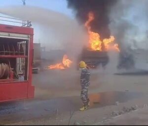 وذكر قائد فوج الإطفاء بدير الزور سمير المغير أن عناصر الفوج تمكنوا من إخماد حريق نشب في صهريج محمل بمادة المازوت في منطقة البغيلية غربي مدينة دير الزور، مبينا أن الحريق تسبب بانفجار الصهريج من الجهة الخلفية وأدى لوفاة شاب في العقد الثاني من العمر وإصابة اثنين آخرين تم اسعافهما إلى مشفى الأسد .