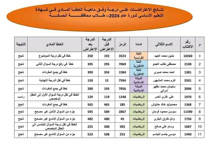 43 طالب وطالبة استفادوا من الاعتراض على علامات شهادة التعليم الأساسي بالحسكة شباب وجامعاتعين الفرات في 13 آب , 2024 شارك FacebookTwitterWhatsAppTelegramFacebook Messenger قالت مصادر مديرية التربية في محافظة الحسكة انه استفاد نحو 43 طالب وطالبة من طلبات الاعتراضات التي قدموها بعد صدور نتائج شهادة التعليم الأساسي في المحافظة الحسكة ـــ حجي المسواط
