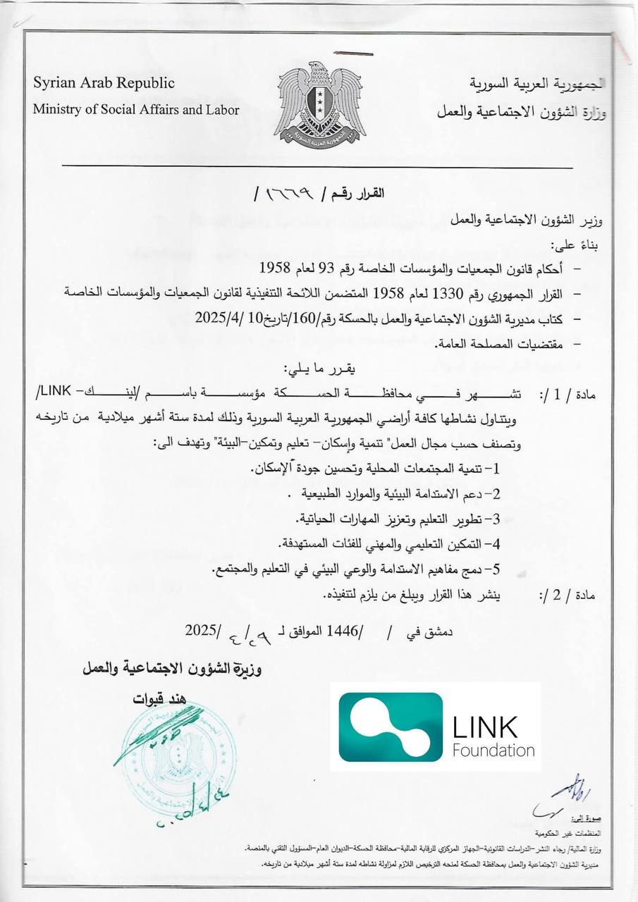 أصدرت وزيرة الشؤون الاجتماعية والعمل الدكتورة هند قبوات قرارا باشهار مؤسسة باسم الينك – LINK #محافظة_الحسكة وتهدف الى: