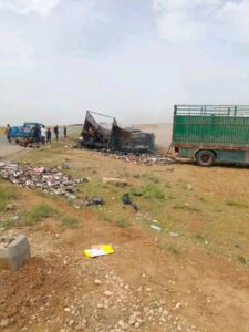 كما أسفر التصادم عن أضرار مادية كبيرة في المركبتين، حيث تحطمت أجزاء من السيارة السياحية بشكل شبه كامل، بينما لحقت أضرار ملحوظة بمقدمة الشاحنة.