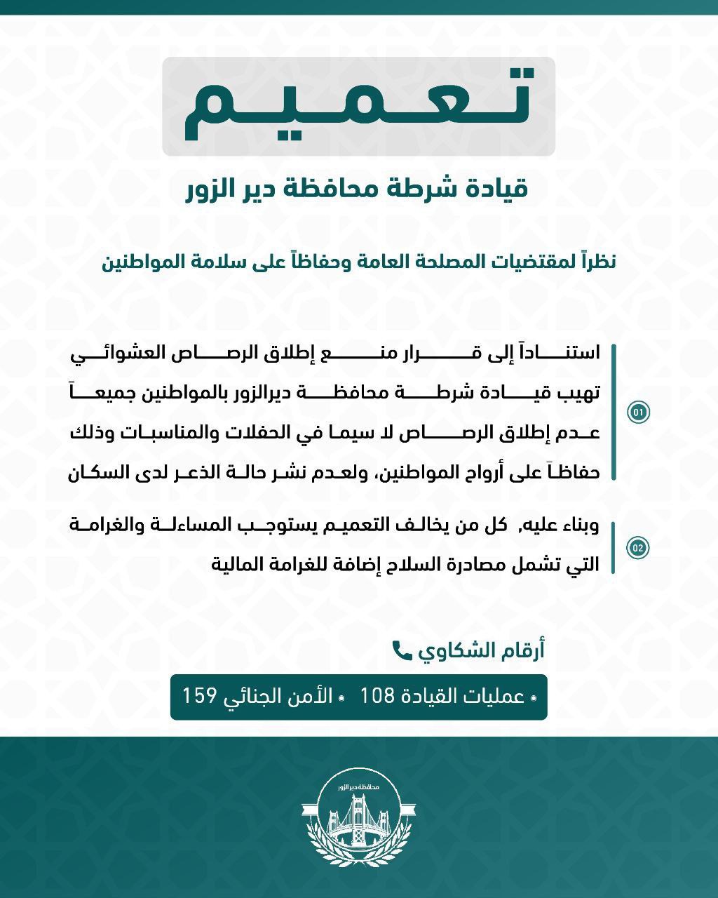 أصدرت قيادة شرطة محافظة دير الزور تعميما جاء فيه “نظراً لمقتضيات المصلحة العامة وحفاظاً على سلامة المواطنين واستناداً إلى قرار منع إطلاق الرصاص تهيب قيادة شرطة محافظة دير الزور بالمواطنين جميعاً عدم إطلاق الرصاص لا سيما في الحفلات والمناسبات وذلك حفاظاً على أرواح المواطنين، ولعدم نشر حالة الذعر لدى السكان.