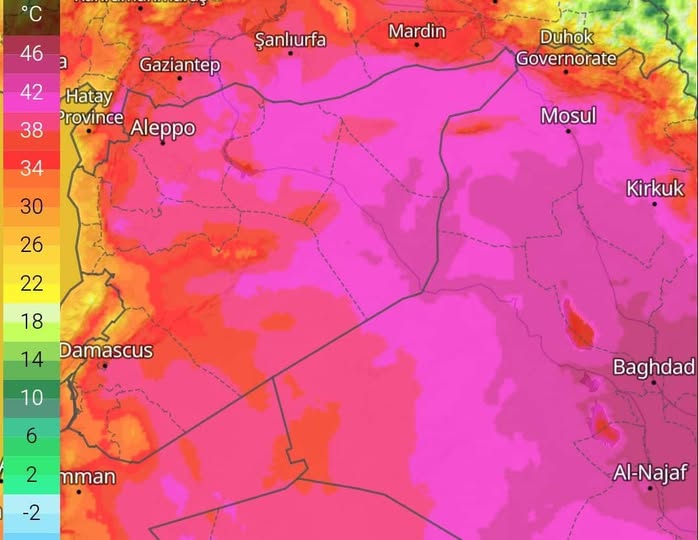 موجة حر متوسطة القوة، تبدأ ذروتها اليوم الثلاثاء وتستمر حتى الجمعة 13 حزيران، على أن تنتهي وتبدأ درجات الحرارة بالانخفاض اعتباراً من السبت 14 حزيران.