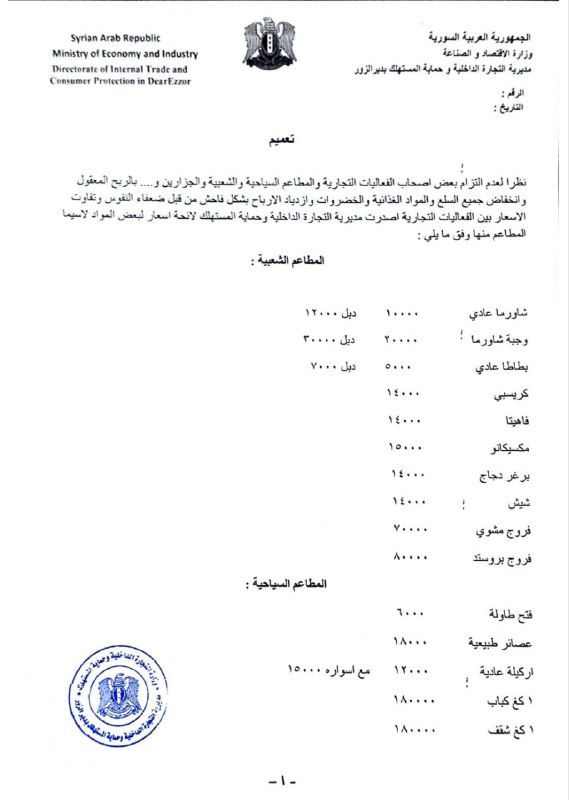 أصدرت مديرية التجارة الداخلية وحماية المستهلك في دير الزور لوائح أسعار جديدة شاملة لعدد من الفعاليات التجارية، بما في ذلك المطاعم السياحية والشعبية، ومحال الوجبات السريعة والجزارين.