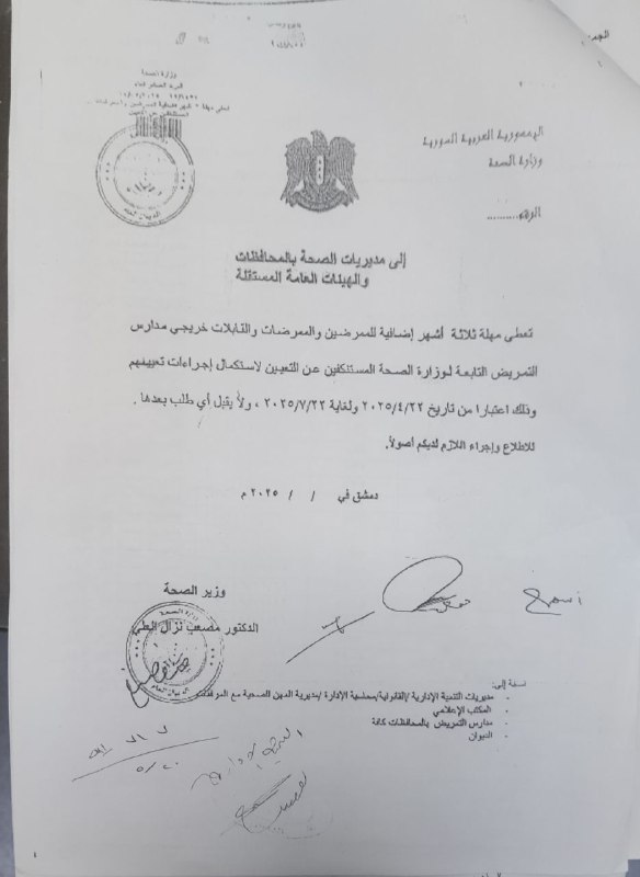 منحت وزارة الصحة الممرضين والممرضات والقابلات خريجي مدارس التمريض التابعة لوزارة الصحة والمستنكفين عن التعيين مهلة ثلاثة أشهر إضافة وأخيرة لاستكمال إجراءات تعيينهم على أن تنتهي المهلة بتاريخ 22 أب القادم، ولا يقبل بعد هذا التاريخ أي طلب.