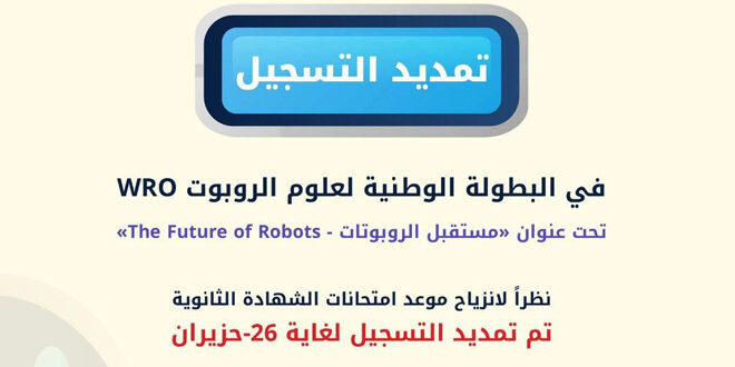 أعلنت هيئة التميز والإبداع تمديد التسجيل في البطولة الوطنية لعلوم الروبوت “WRO Syria 2025”، المؤهلة لأولمبياد الروبوت العالمي، والمقررة إقامتها تحت عنوان “مستقبل الروبوتات”، وذلك لغاية السادس والعشرين من شهر حزيران الجاري.