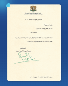 أصدر السيد الرئيس أحمد الشرع المرسوم رقم (118) لعام 2025 القاضي بتعيين السيد طلال محمود الهلالي مديراً عاماً لهيئة الاستثمار السورية.