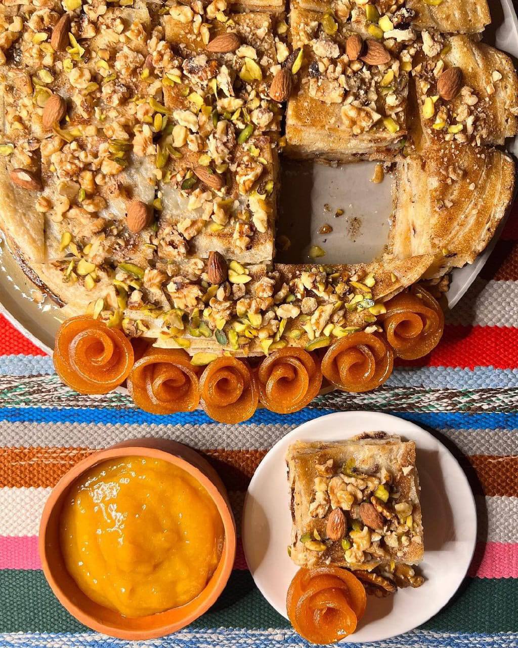 ثم نقومبفرش طبقة منه في صحن كبير وعميق منسف، تعلوه طبقة من مادة الجوز المقشر والمكسر، وتعاد هذه العملية عدة مرات حتى يمتلأ الصحن.