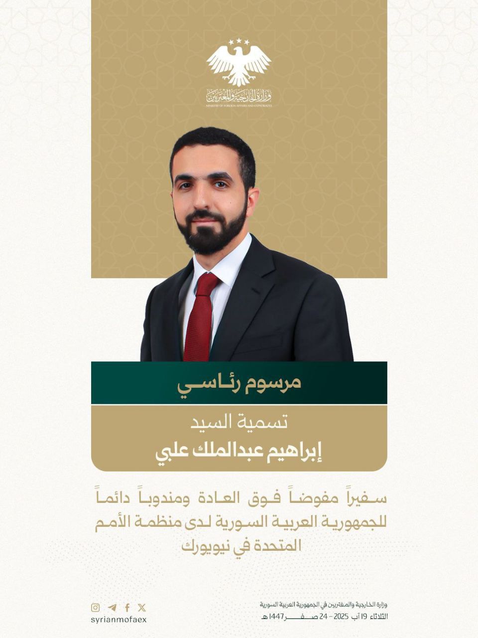 أصدر السيد الرئيس أحمد الشرع اليوم المرسوم رقم (142) لعام 2025، القاضي بتعيين السيد إبراهيم عبد الملك علبي سفيراً مفوضاً فوق العادة، ويعتمد مندوباً دائماً للجمهورية العربية السورية لدى منظمة الأمم المتحدة في نيويورك.