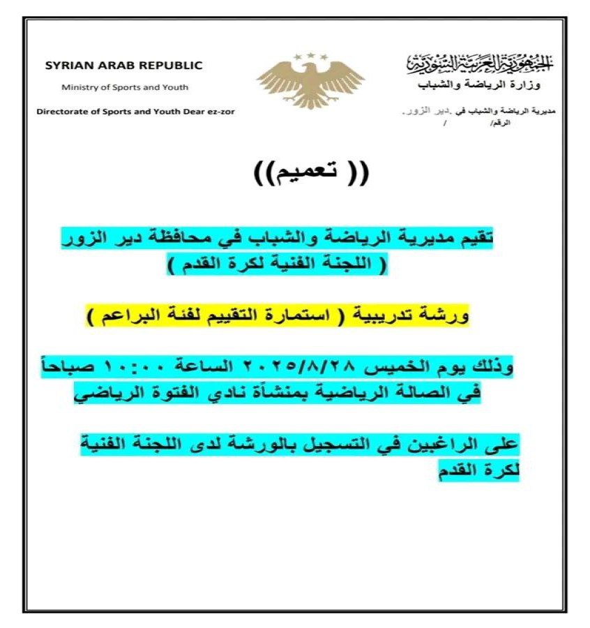 تقيم مديرية الرياضة والشباب – اللجنة الفنية لكرة القدم – في محافظة ديرالزور ورشة تدريبية ( استمارة التقييم لفئة البراعم ) وذلك يوم الخميس 2025/8/28 الساعة العاشرة صباحاً على أرض ملعب الصالة الرياضية بمنشأة نادي الفتوة الرياضي، على الراغبين بالتسجيل في الورشة مراجعة اللجنة الفنية لكرة القدم