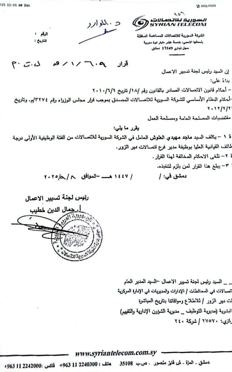 العلوش مديراً لفرع اتصالات دير الزور عين الفرات في 9 أيلول , 2025 شارك FacebookTwitterWhatsAppTelegramFacebook Messenger أصدر رئيس اللجنة المكلفة بتسيير أعمال الشركة السورية للاتصالات جمال خطيب القرار 609/1/ق القاضي بتكليف الأستاذ ماجد مهيدي العلوش من الفئة الوظيفية درجة الوظائف القيادية العليا مديراُ لفرع اتصالات دير الزور. الفرات
