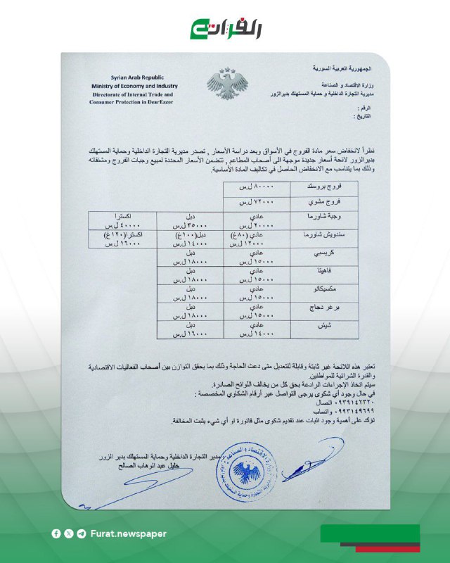 أصدرت مديرية التجارة الداخلية وحماية المستهلك في محافظة دير الزور اليوم، لائحة أسعار جديدة موجهة لأصحاب المطاعم، تتضمن تحديد أسعار بيع وجبات الفروج، وذلك بما يتناسب مع الانخفاض الحاصل في تكاليف المادة الأساسية، بعد دراسة الأسعار من قبل اللجان المختصة في المديرية.