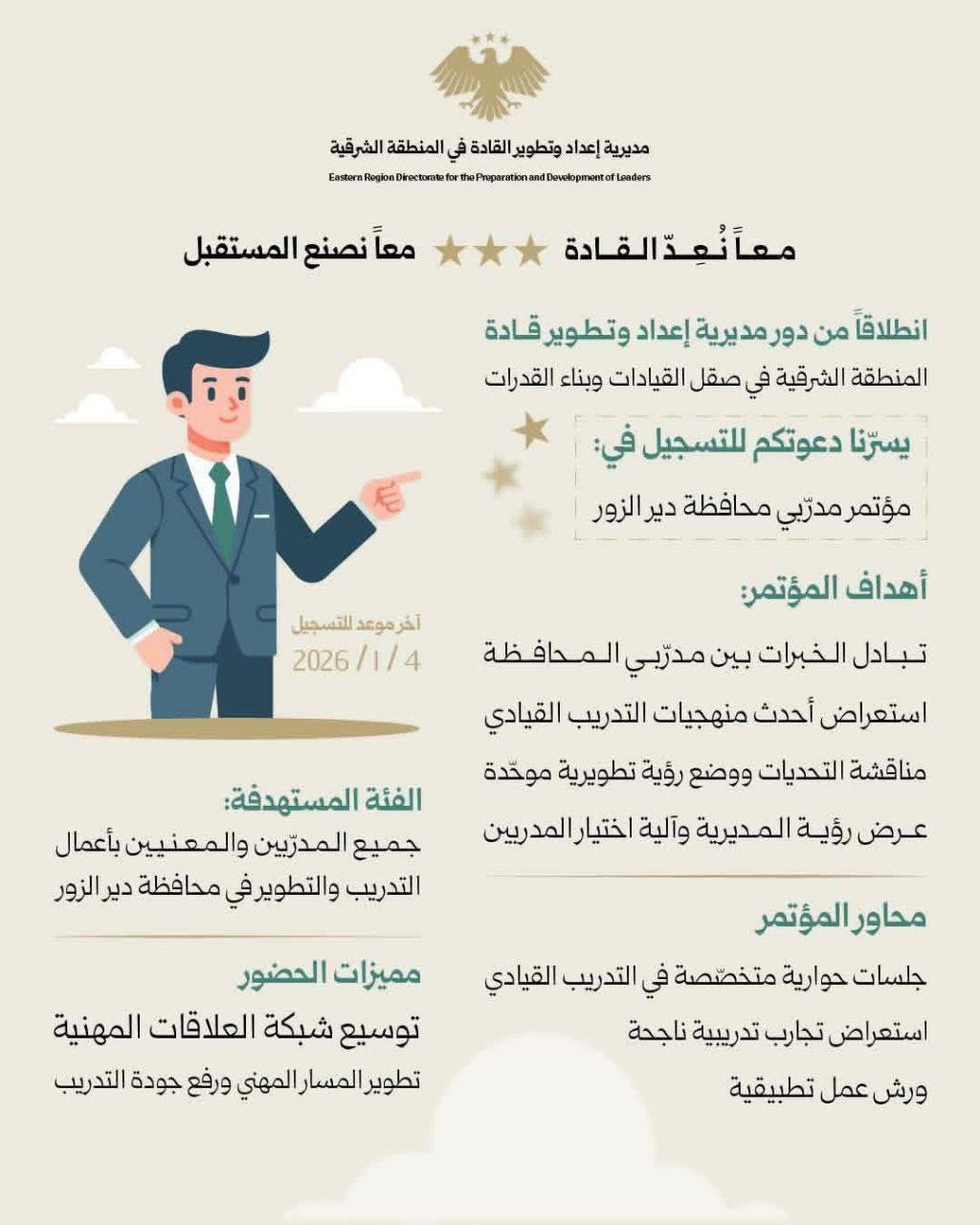 أعلنت مديرية إعداد وتطوير القادة في المنطقة الشرقية عن إطلاق مؤتمر مدربي محافظة دير الزور، في خطوة تهدف إلى صقل الكفاءات الوطنية وبناء القدرات القيادية.