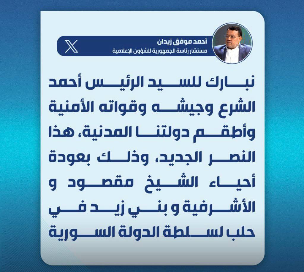 نبارك للسيد الرئيس أحمد الشرع وجيشه وقواته الأمنية وأطقم دولتنا المدنية، هذا النصر الجديد، وذلك بعودة أحياء الشيخ مقصود و الأشرفية و بني زيد في حلب لسلطة الدولة السورية، ودرسٌ مهم ينبغي أن يصاحبنا جميعاً بعد اليوم، وهو الثقة بهذه الدولة، وبقدرتها على تقدير مواقف الإقدام والإحجام.