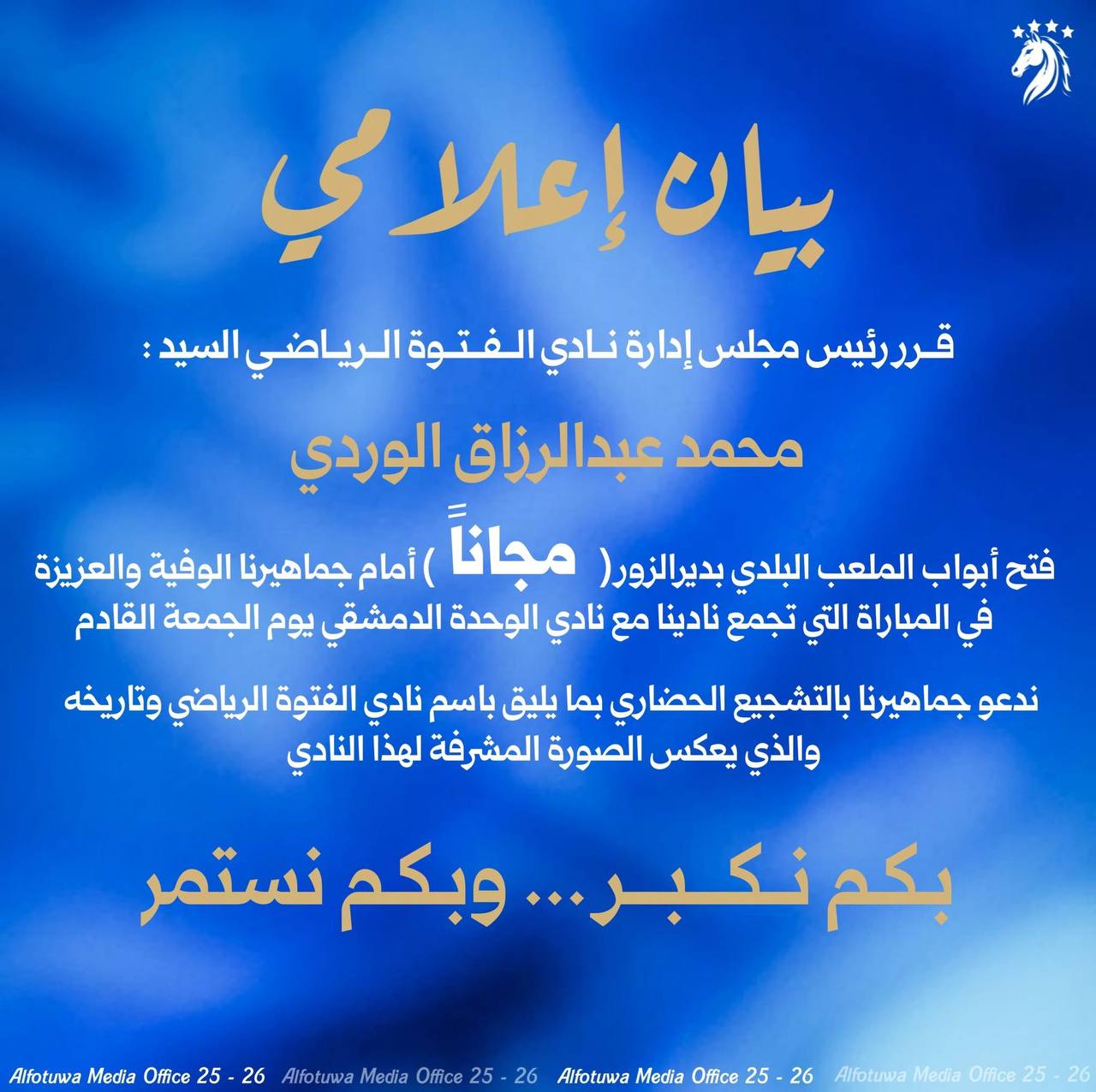 أصدر رئيس مجلس إدارة نادي الفتوة الرياضي، السيد محمد عبد الرزاق الوردي، قراراً بفتح أبواب الملعب البلدي في دير الزور “مجاناً” أمام الجماهير، ويأتي هذا القرار لدعم الفريق في مباراته المرتقبة ضد نادي الوحدة الدمشقي والمقرر إقامتها يوم الجمعة القادم.