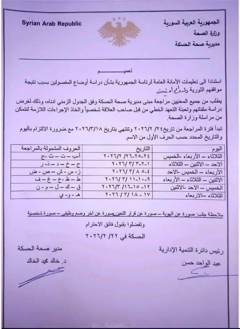 وأوضحت المديرية أن المراجعة ستبدأ اعتباراً من 24 شباط 2026 وتستمر حتى 18 آذار 2026، حيث تم تحديد أيام مخصصة لكل فئة حسب الترتيب الأبجدي للأسماء، مع التأكيد على ضرورة الالتزام بالمواعيد المحددة.