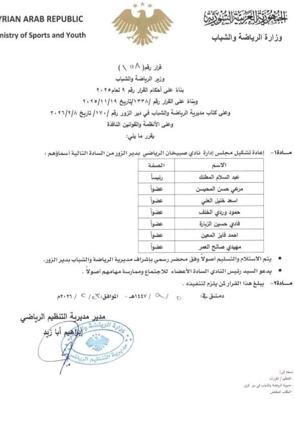 إعادة تشكيل إدارة نادي صبيخان الرياضي رياضة في 24 شباط , 2026 شارك FacebookTwitterWhatsAppTelegramFacebook Messenger قررت مديرية التنظيم الرياضي في وزارة الرياضة والشباب السورية إعادة تشكيل مجلس إدارة نادي صبيخان الرياضي والذي تكون من السادة: عبدالسلام المطلك رئيساً مرعي المحيسن، أسعد العلي، حمود الخلف، فادي الزبارة ، احمد المعين، مهيدي العمر أعضاء