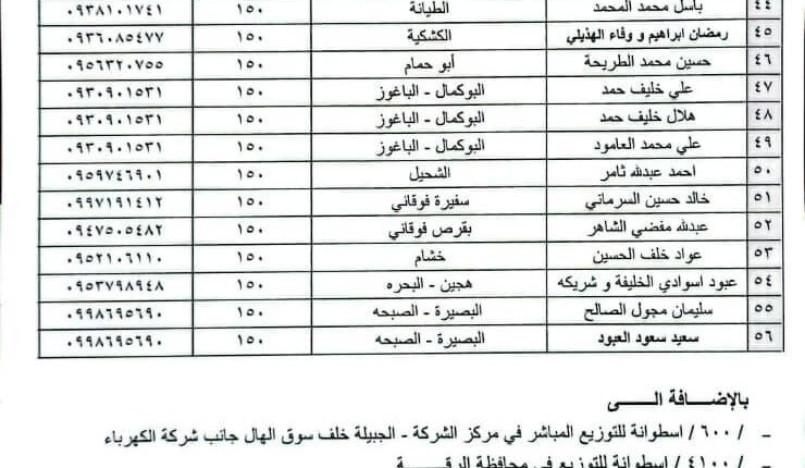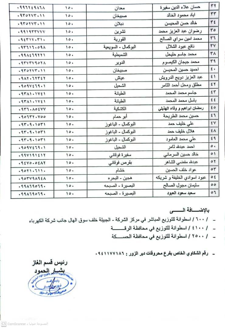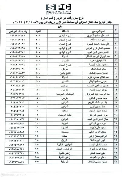 أعلن فرع محروقات دير الزور عن جدول توزيع الغاز المنزلي لليوم الأحد 1-3-2026، وذلك لضمان وصول الخدمة إلى جميع المواطنين في محافظة دير الزور وريفها.