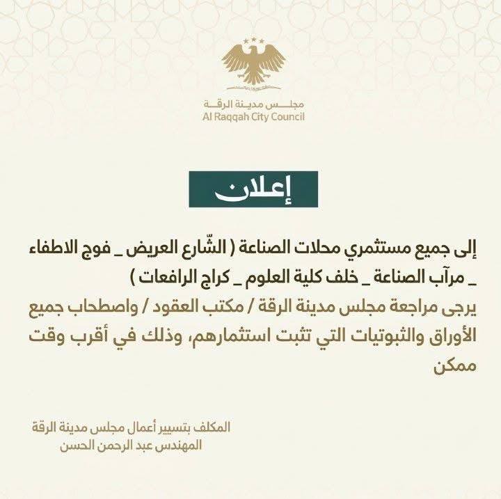 أصدر مجلس مدينة الرقة إعلاناً رسمياً موجهًا إلى جميع مستثمري المحلات في المناطق الصناعية والخدمية داخل المدينة، داعيًا إياهم لمراجعة الدوائر المختصة لتدقيق أوراقهم الثبوتية.